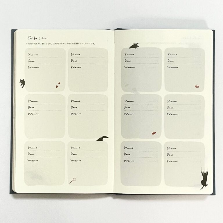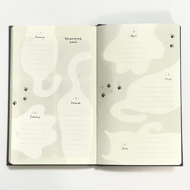 本のような布クロスの表紙には、かわいいネコ柄の箔押しが施されています。