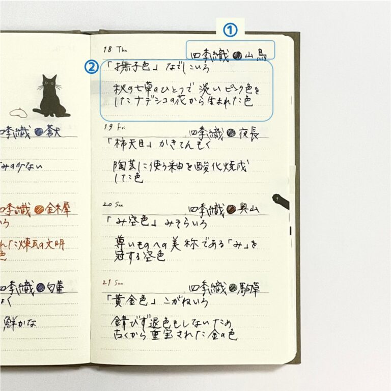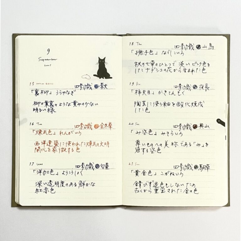 ②の「和色日記」は、新日本カレンダーさんが運営されている暦生活の人気コンテンツの日めくりカレンダー「にっぽんのいろ日めくり」に書かれている、色の名前と説明を参照して書く日記です。