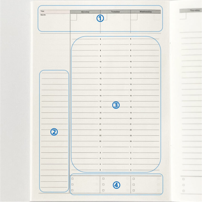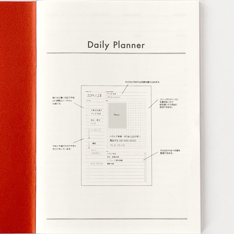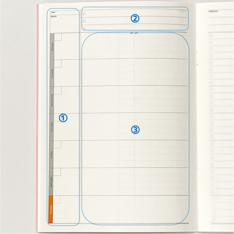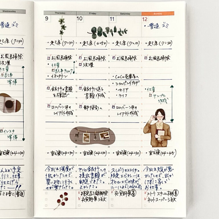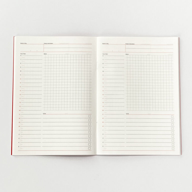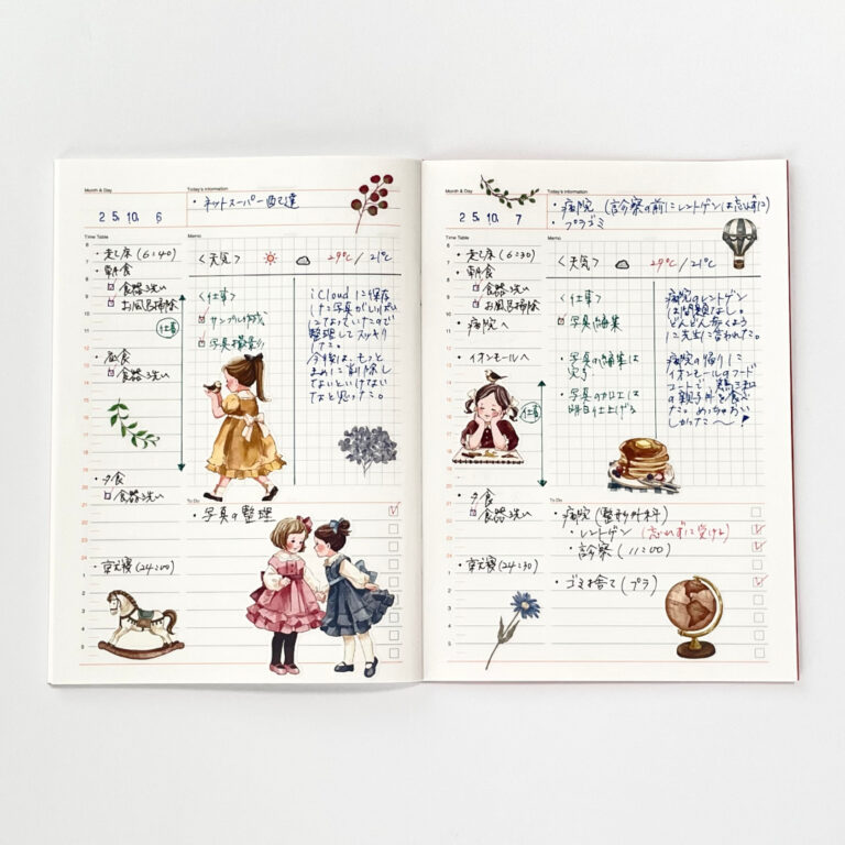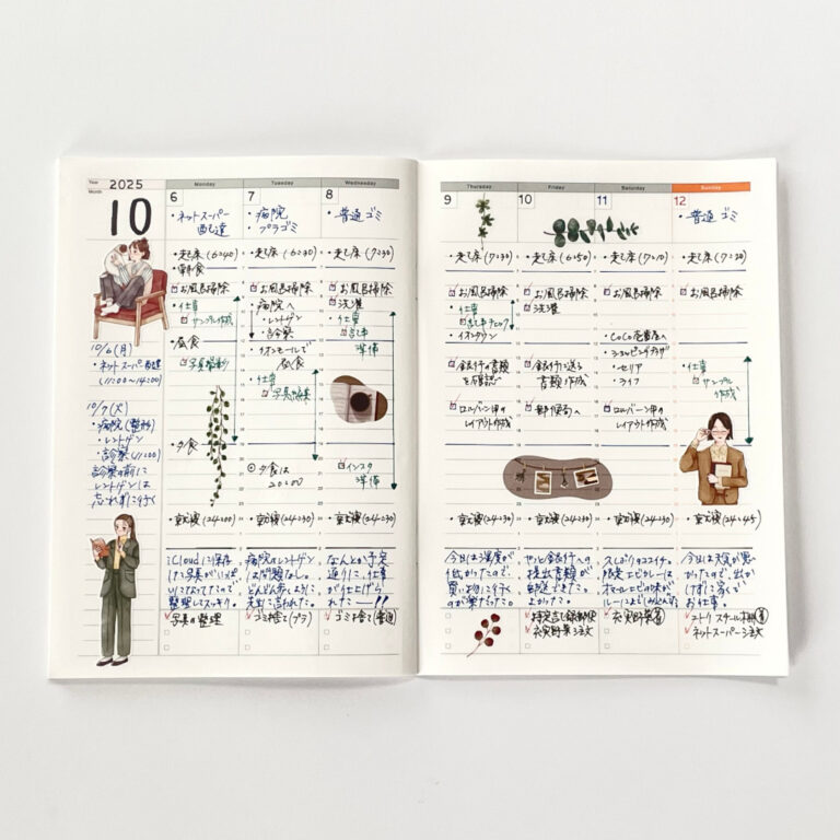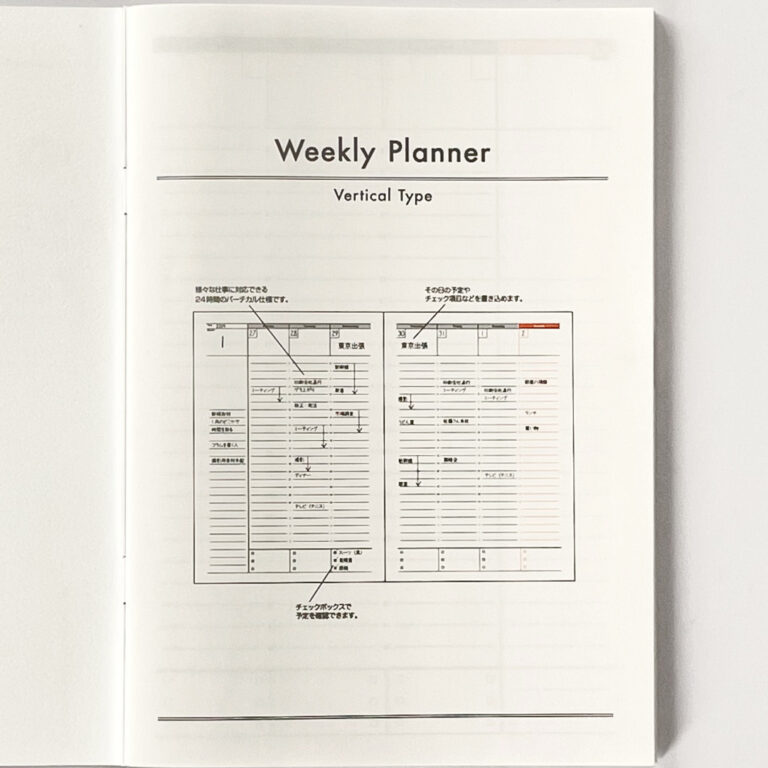1週間が見開き2ページの、毎日の予定などを時間で管理するバーチカルタイプのレイアウトです。