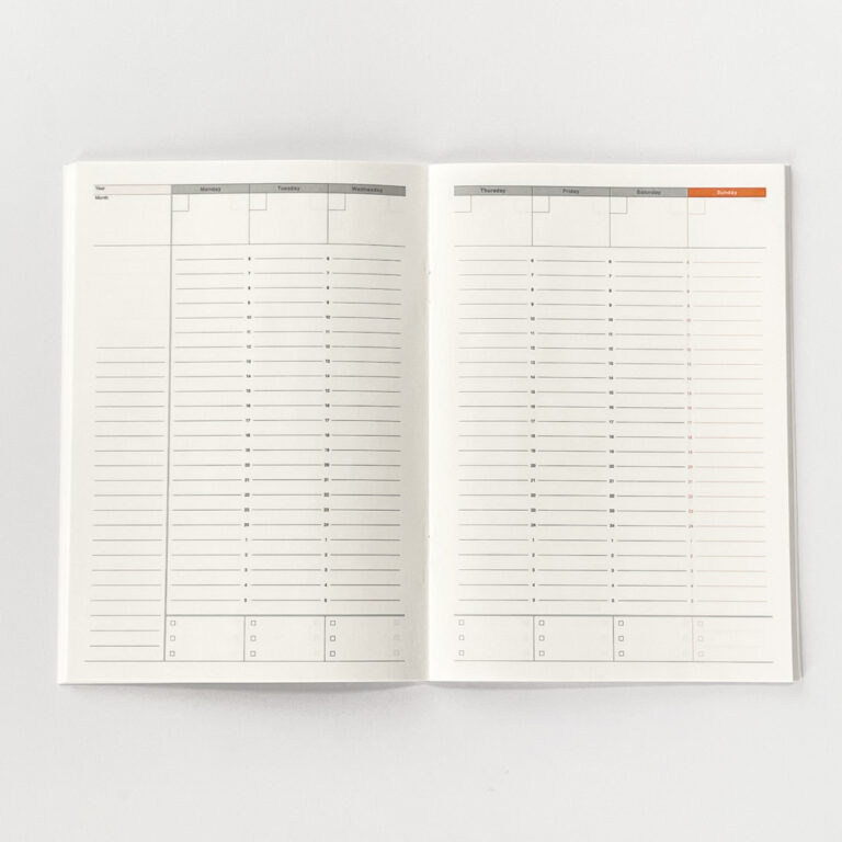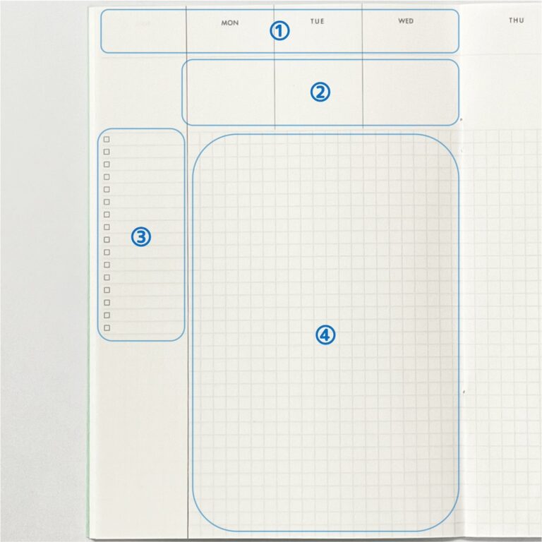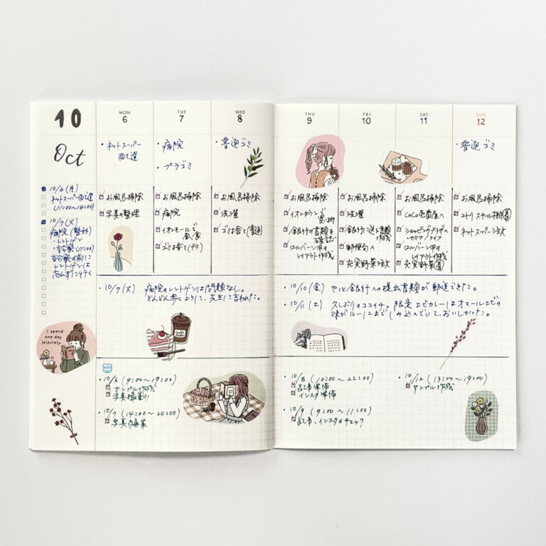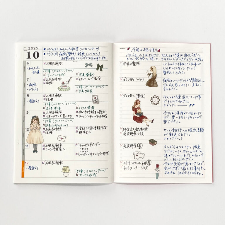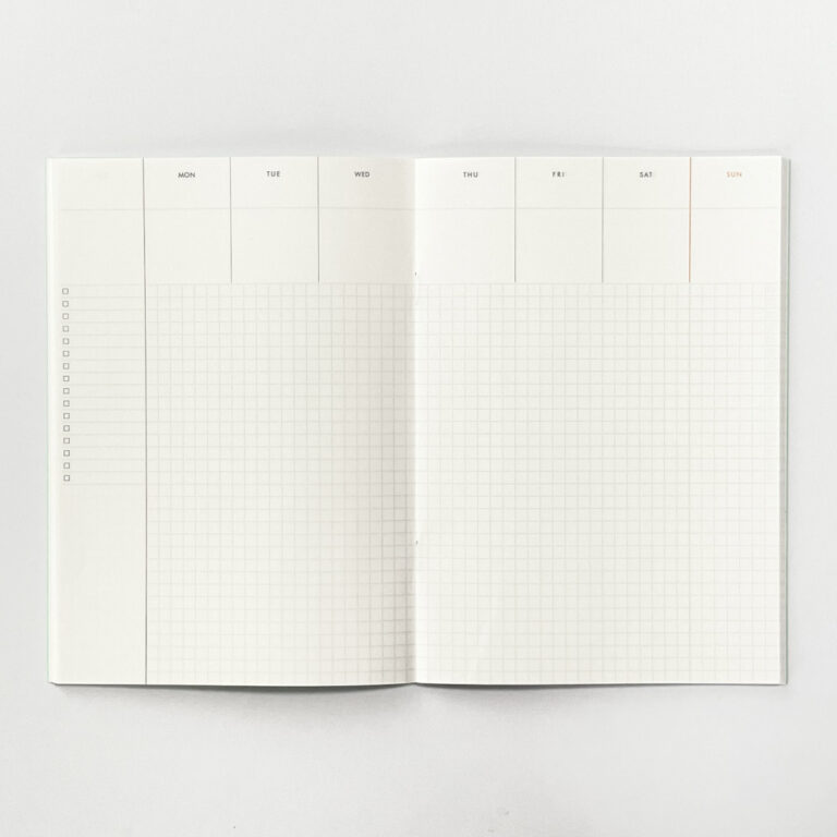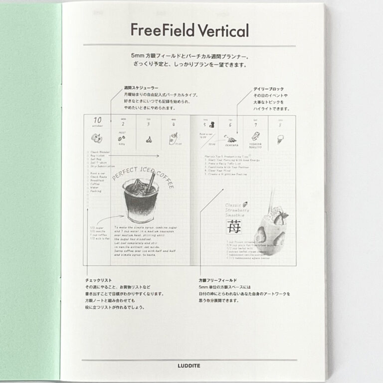 1週間が見開き2ページの、週間バーチカルプランナーと5mm方眼フィールドを合わせたレイアウトです。週間バーチカルプランナーには主な予定や出来事を書いて、5mm方眼フィールドには日付の枠にとらわれずに自由に書き込めます。