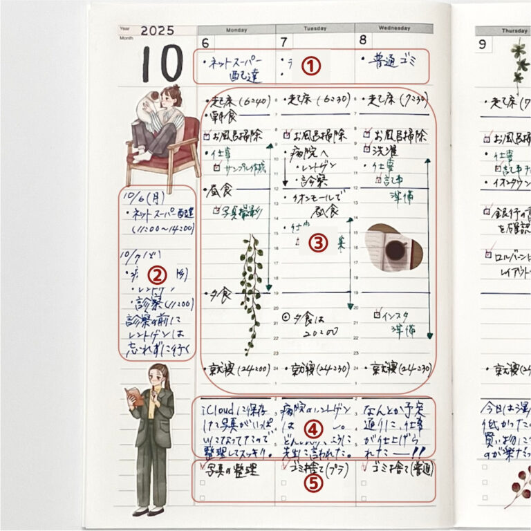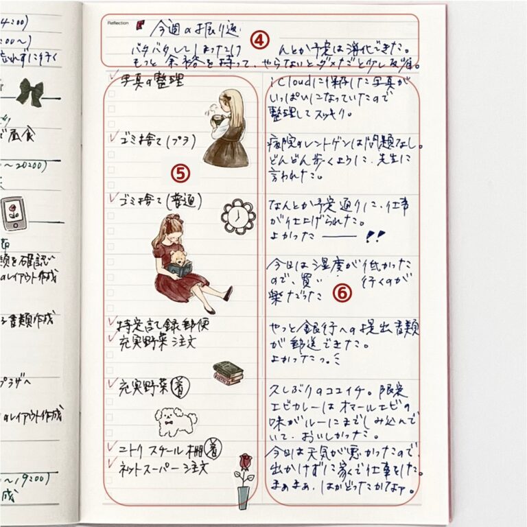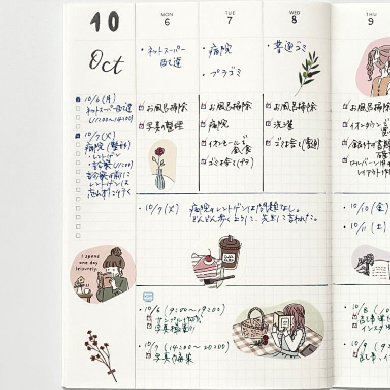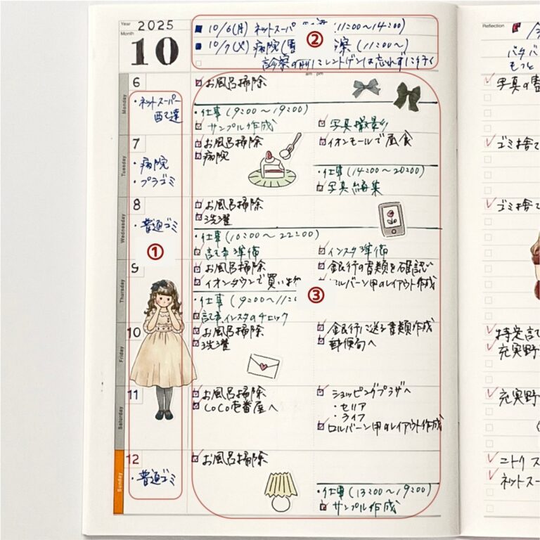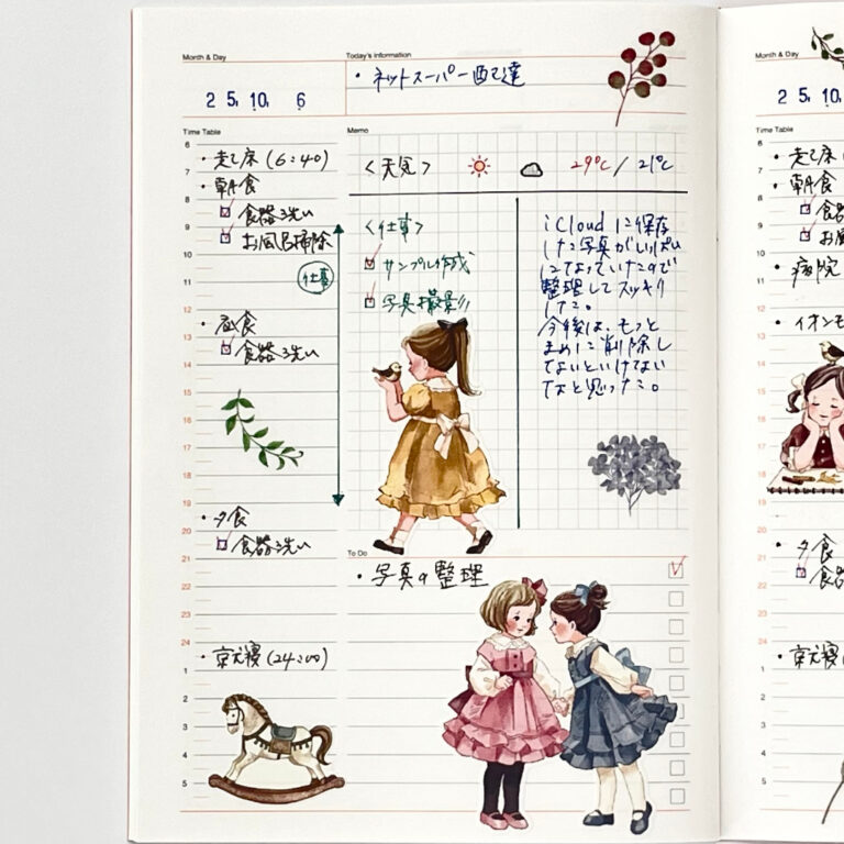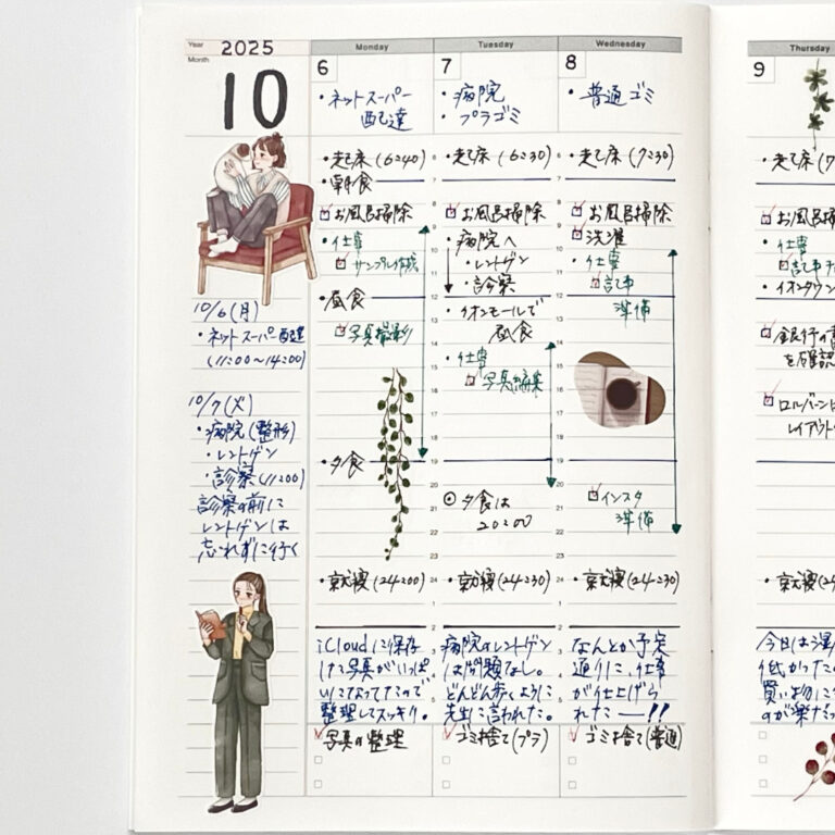 1週間が見開き2ページの、週間バーチカルプランナーと5mm方眼フィールドを合わせたレイアウトです。週間バーチカルプランナーには主な予定や出来事を書いて、5mm方眼フィールドには日付の枠にとらわれずに自由に書き込めます。