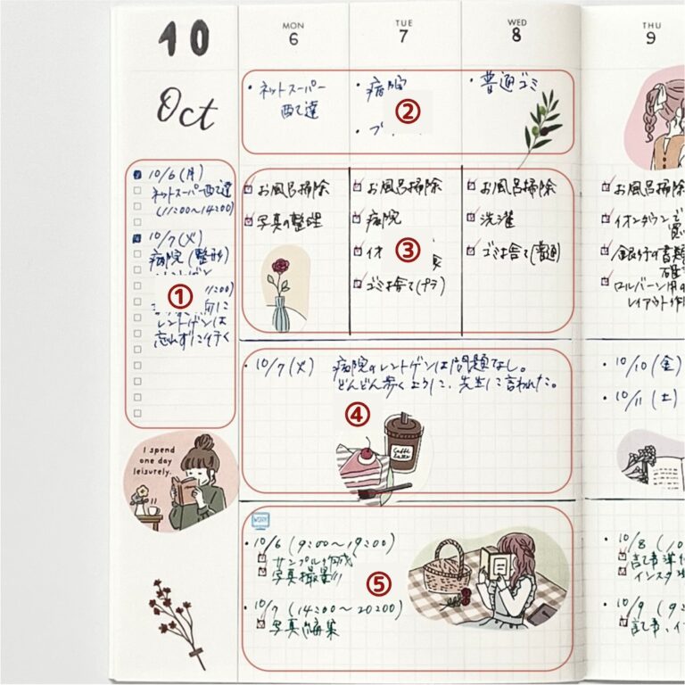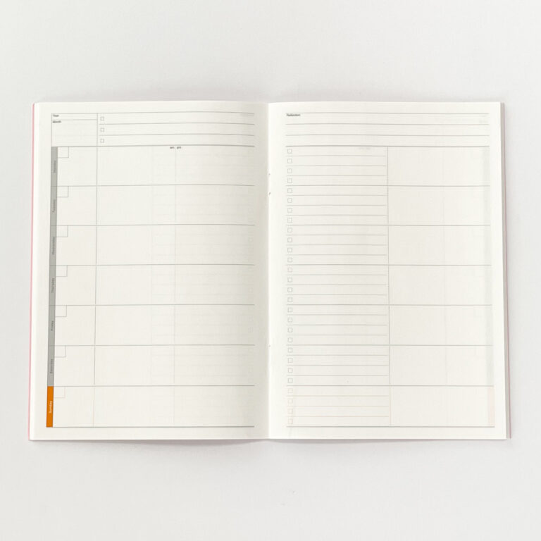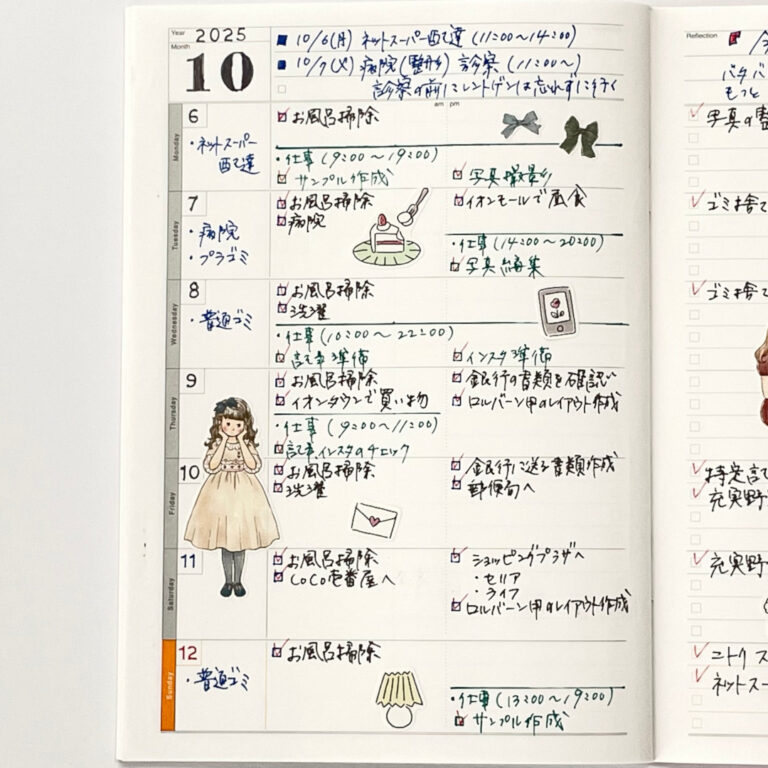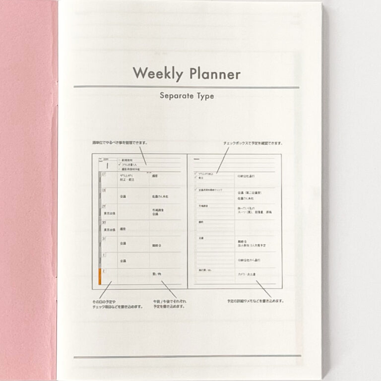 1週間が見開き2ページの、毎日の予定などを午前と午後で分けて管理するセパレートタイプのレイアウトです。