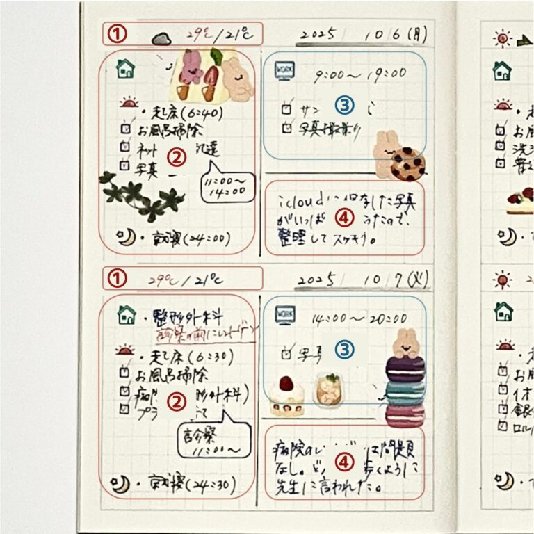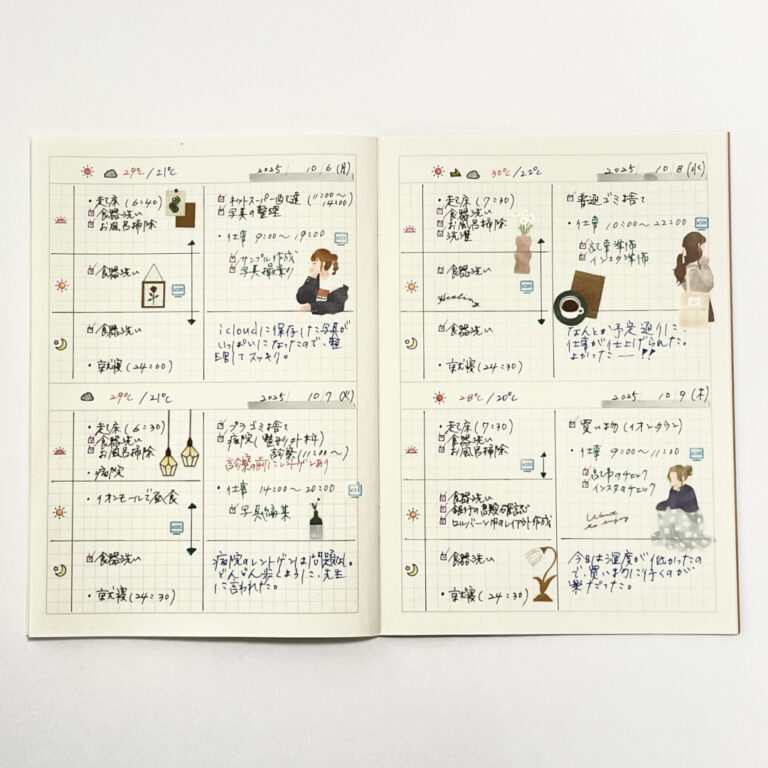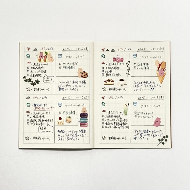 見開き2ページで4日分書けるデイリーレイアウトの、おすすめのライフログの書き方です。