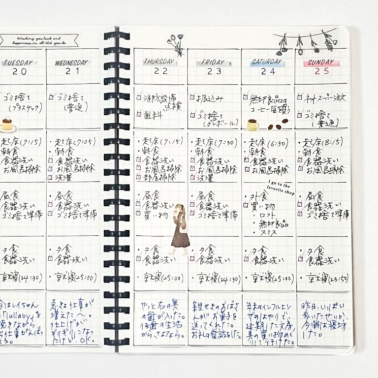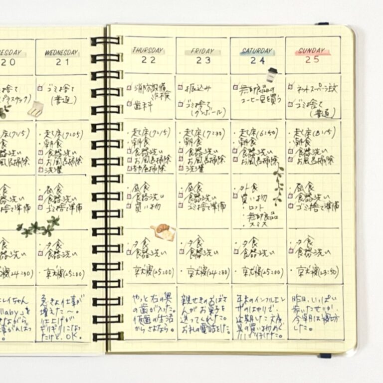 1週間分を見開き2ページで一度に見れるウィークリーは、TODOを管理して習慣化するのに便利なレイアウトです。