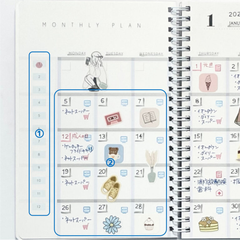 ②はマンスリーの手帳に書くような、予定や出かけた場所、食べた物などを簡単に記録します。