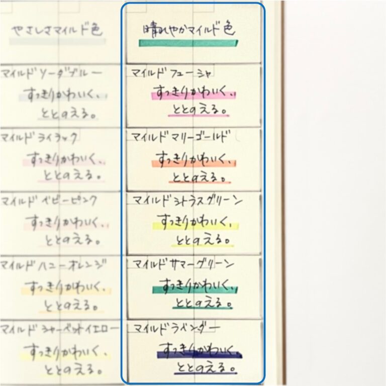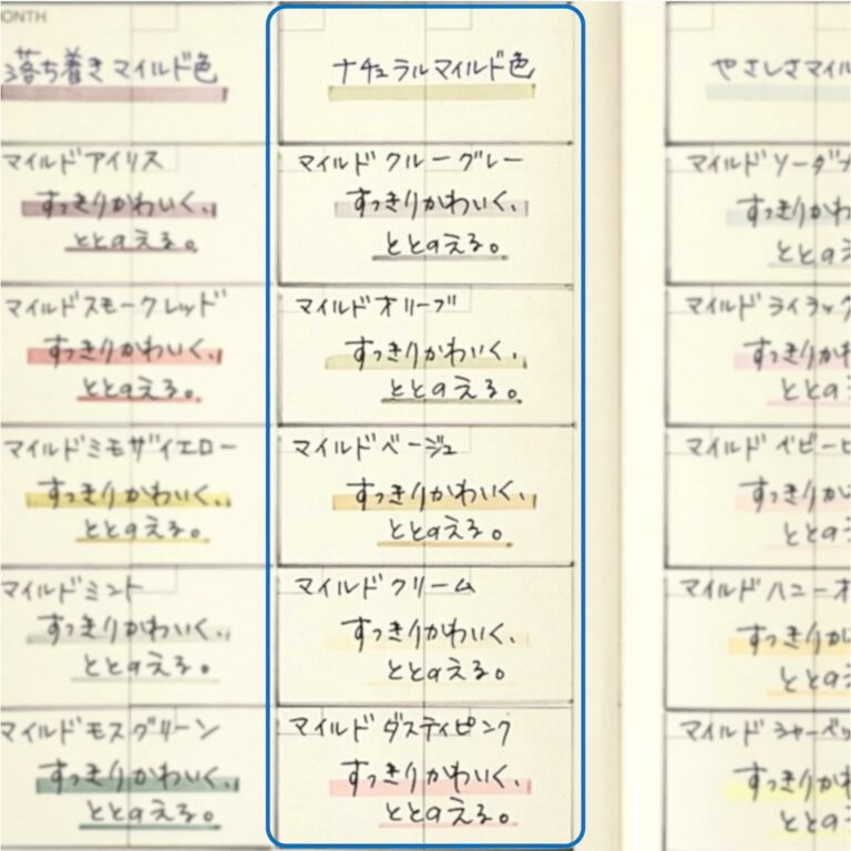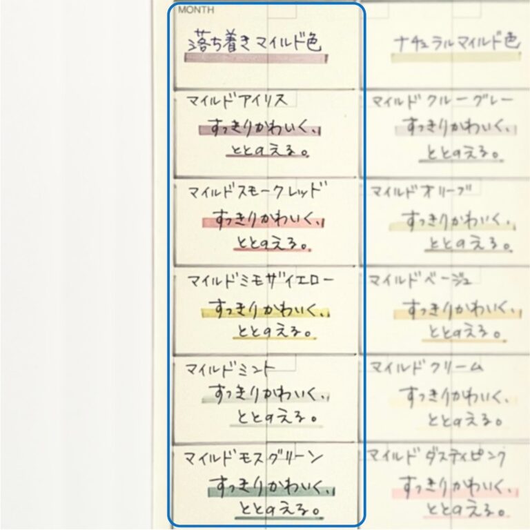 | 落ち着きマイルド色 | マイルドアイリス、マイルドスモークレッド、マイルドミモザイエロー、マイルドミント、マイルドモスグリーン |