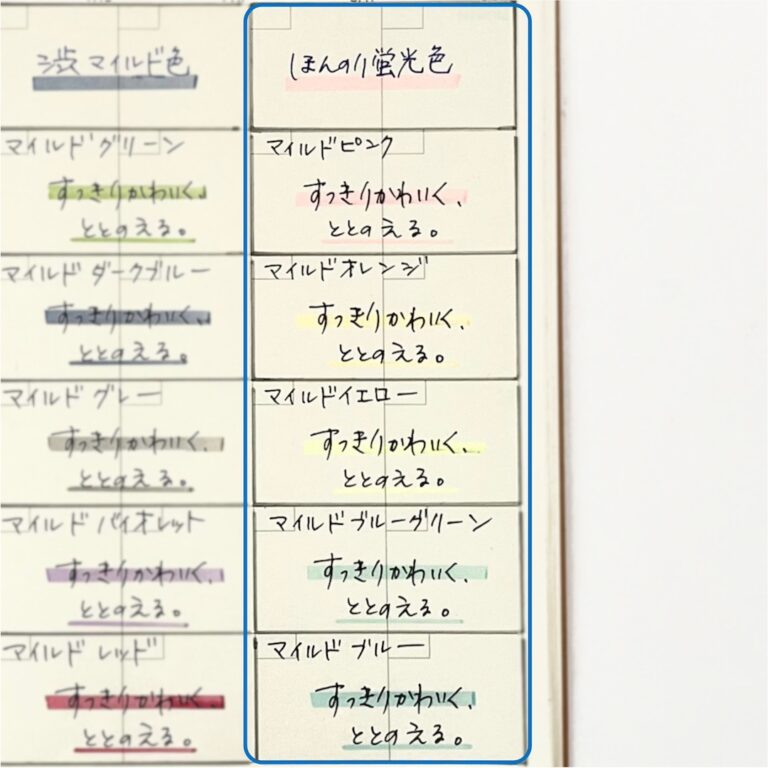| ほんのり蛍光色 | マイルドピンク、マイルドオレンジ、マイルドイエロー、マイルドブルーグリーン、マイルドブルー |